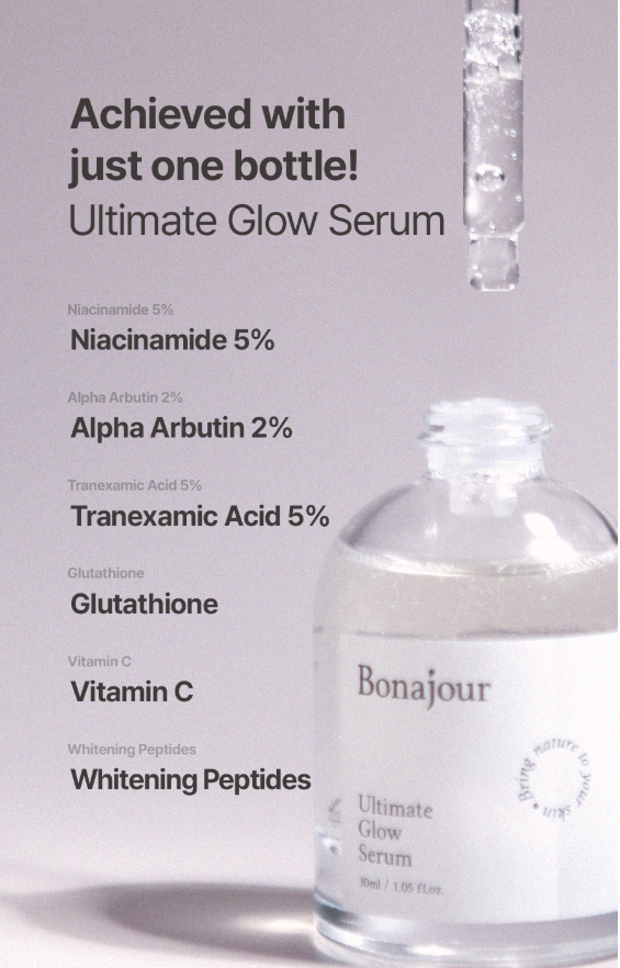 يحتوي على نياسيناميد، حمض الترانيكساميك، الجلوتاثيون، فيتامين C، وببتيدات التفتيح لتفتيح البشرة ومنحها إشراقة طبيعية.