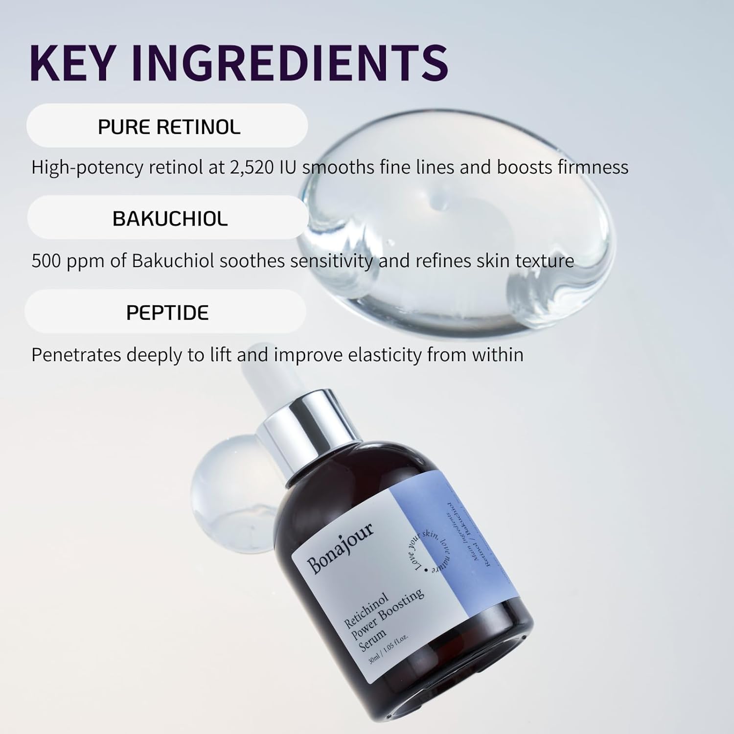 مزيج فريد من الريتينول المغلف عالي التركيز والباكوشيول مع المركب منخفض الجزيئات لتحسين ملمس البشرة، تقليل التجاعيد، ومنح الترطيب العميق. مثالي للأشخاص المترددين في استخدام الريتينول بسبب التهيج الجلدي الذي يسببه عادةً.